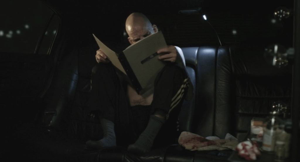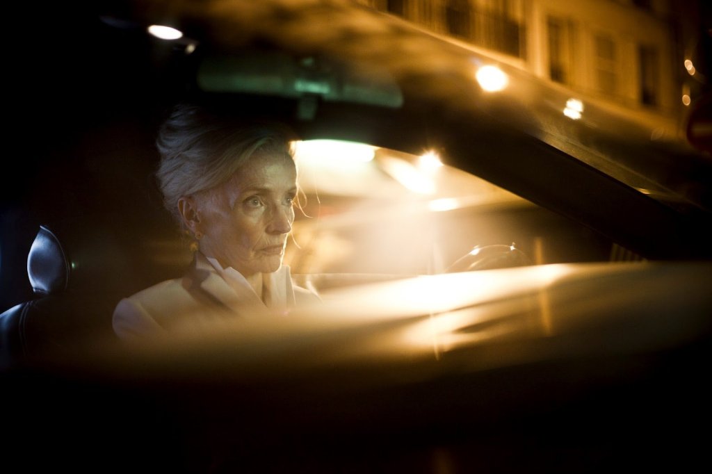 Mr. Oscar’s got one last appointment, but he’s hardly in a fit state to fulfil it. He’s lost bits of himself as the day’s gone on and now he drowns his sorrows in the back of the limo, naked beneath his dressing gown. He wants to laugh, he wants to dance – he seems to want a moment of spontaneous authenticity after all his studied performance. And there is a fleeting moment when a pigeon nearly flies into the windshield that offers both him and Céline a chance to improvise. He cracks a joke and they both laugh. It’s a rare moment of genuine emotion, but it’s short lived. Their smiles withdraw into weary resignation once again as Oscar steels himself for his final appointment, and Céline returns the limo to its overnight depot. What do you make of this double ending, Jim?