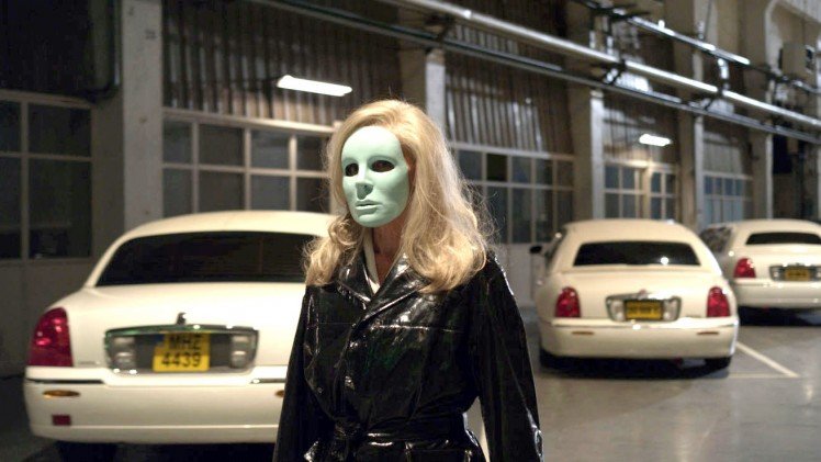 Meanwhile, Céline drives the limo to a large, hanger-like building called “Holy Motors”, spelled out in big green neon letters, along with scores of other huge limousines. After attaching a pale blue mask to her face, Céline exits the car and walks out of the building, as she tells someone on her cell phone that she’s coming home. With the humans gone, the rows of parked limos start talking to each other in the darkened garage, about their day, and about their fate, since some indeterminate “they” doesn’t want visible machines anymore. And that’s the end.